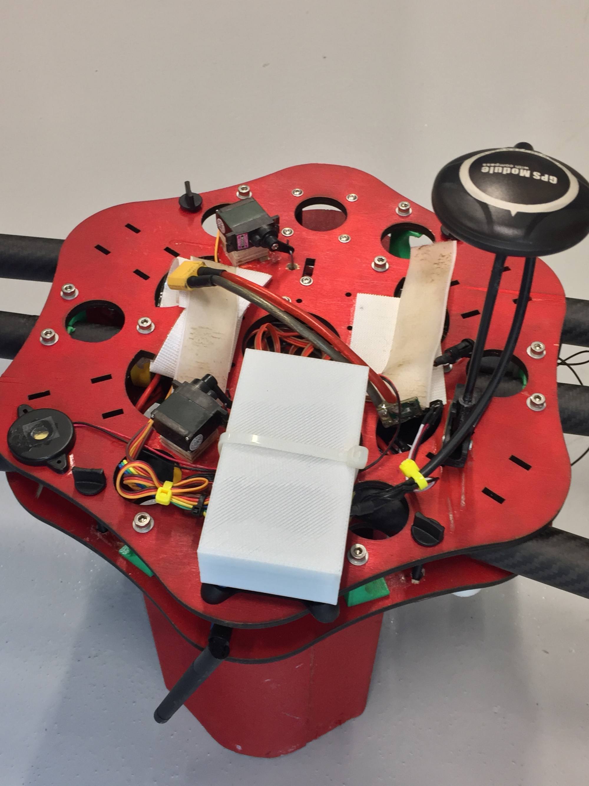 - Mark 3, showing how components are arranged. Thumb screws for foldable arms. Flight controller protected with printed weather shields and servos to release the payloads
