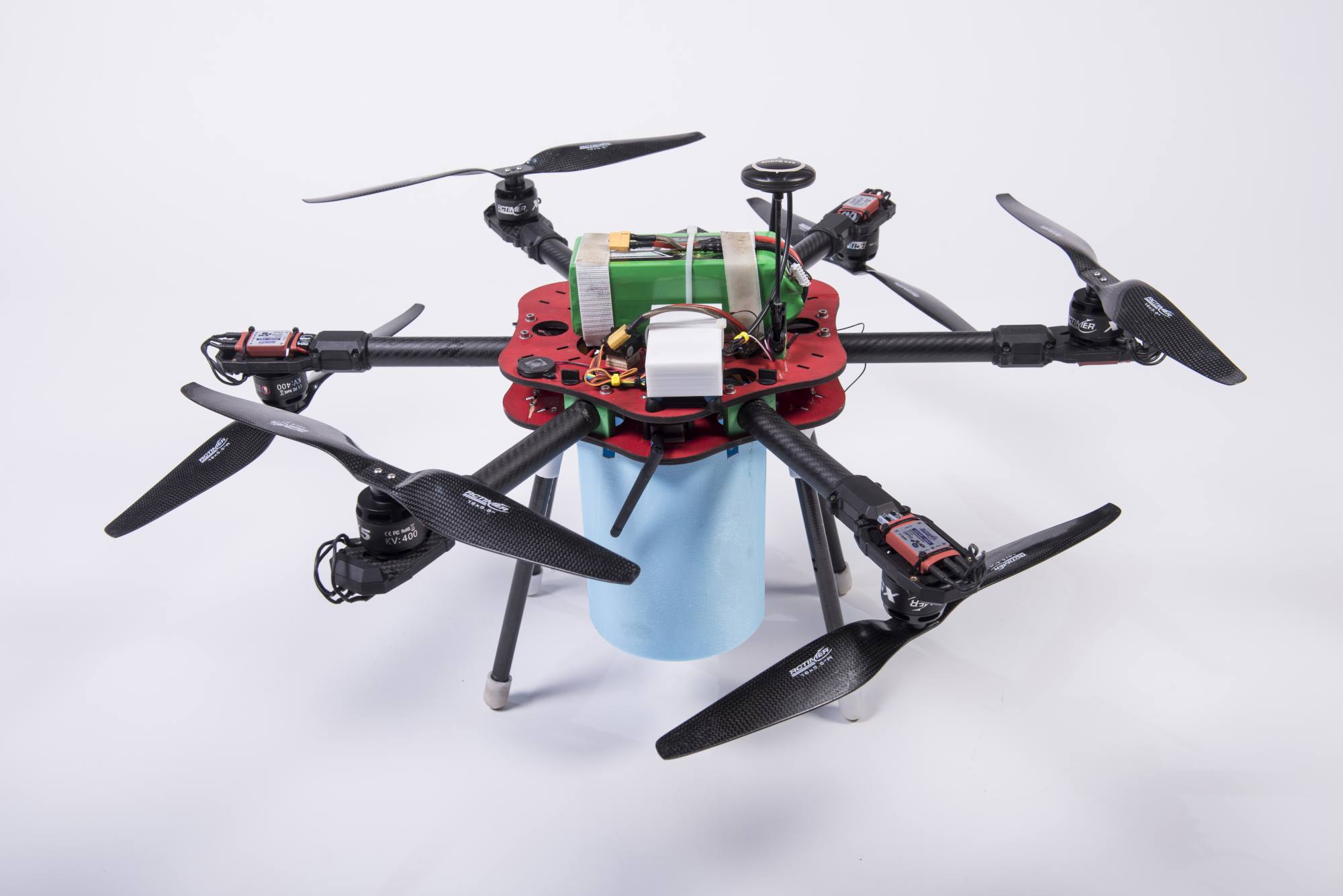 The system is a hexacopter with two arms fixed at each side with the remaining four arms able to fold towards the fixed arms, making it a linear folding system. The bottom plate is fitted with a cargo support bay, payload release mechanism, detachable landing gear and a camera for the imaging system. The top plate holds the battery, GPS module, payload servos and the flight controller. These modules have all been made weather-proof by applying epoxy on circuit boards or using 3D printed weather shields.
