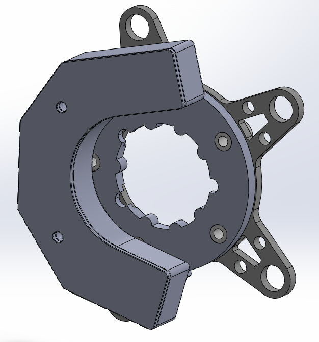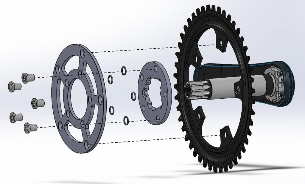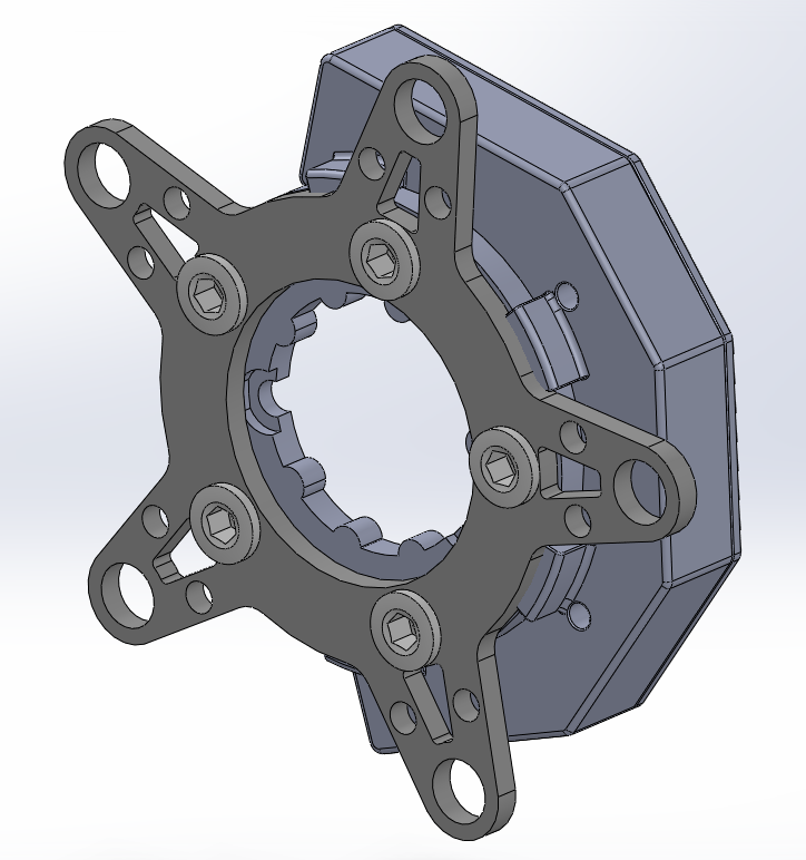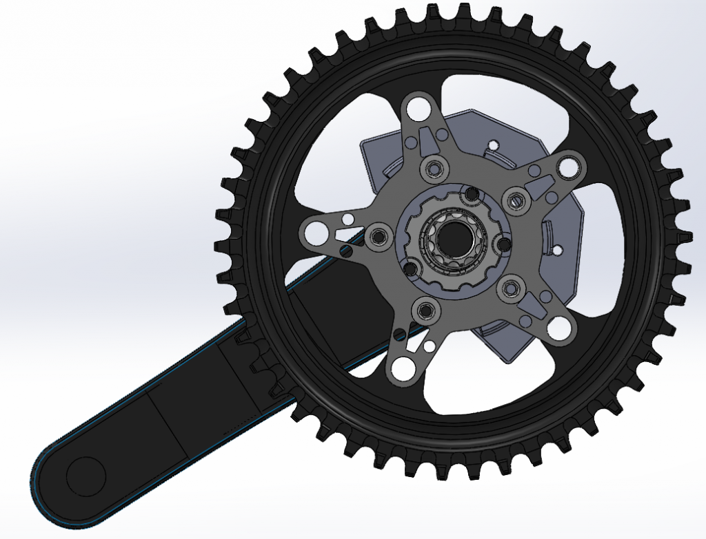 Rear view render of final OpenPower spider design installed, illustrating crank-spider and spider-chainring interfaces